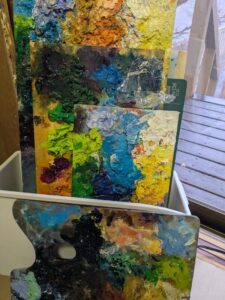 周りを汚し おまけに 両手も筆も絵の具まみれ